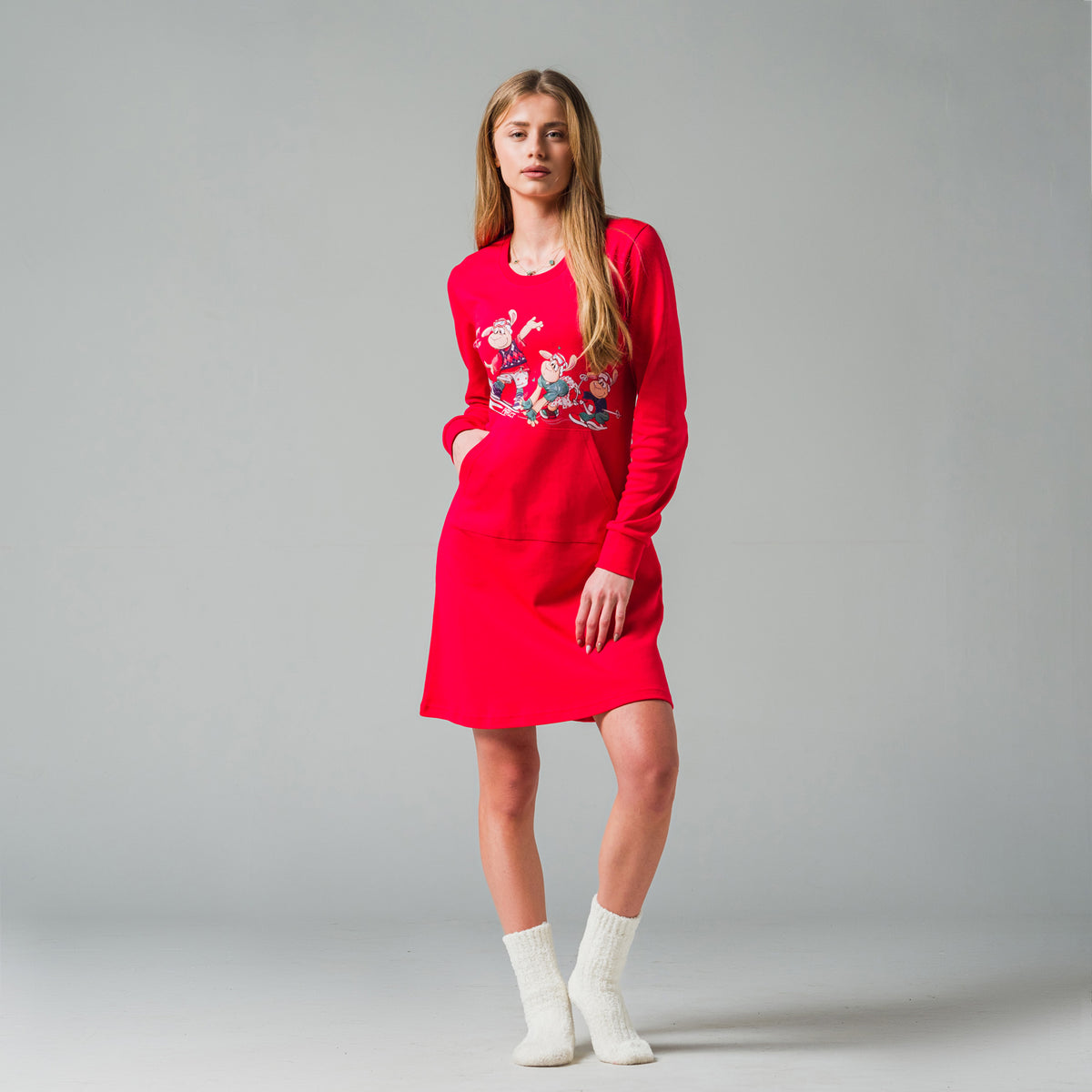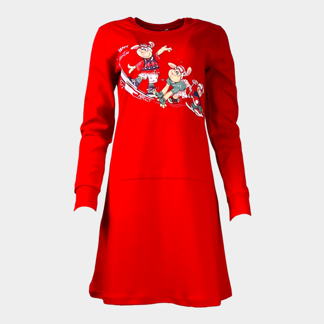• Нощница в червен цвят с коледна щампа и голям джоб