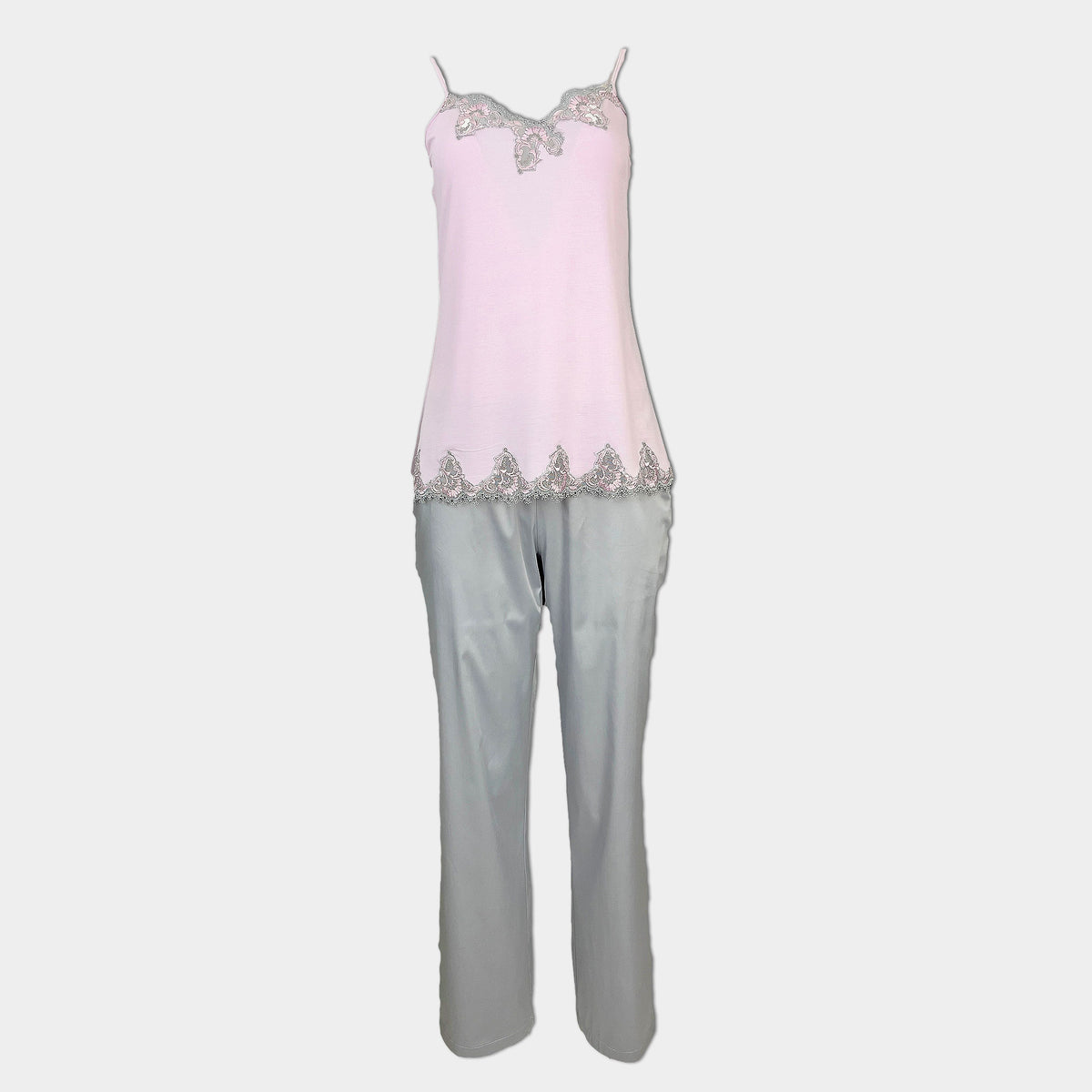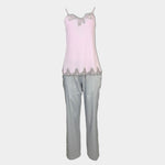 Елегантна дамска пижама, изработена в две части - потник с дантела и дълъг сатенен прав панталон.